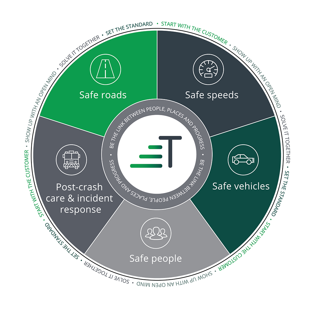This diagram shows how our integrated road safety approach is guiding us in achieving our ultimate vision of zero fatalities and life-changing injuries on our roads.