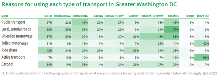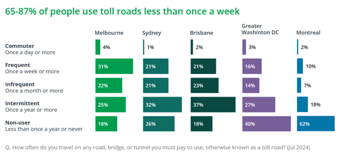 We asked people in Melbourne, Sydney, Brisbane, the Greater Washington Area, and Montreal how regularly they use toll roads. We found most people use toll roads occasionally, and in most cases, less than once a week.