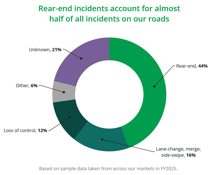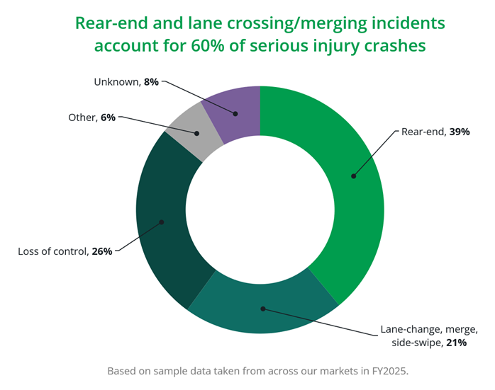 The most common types of crashes we see on our roads are rear-enders and out-of-control vehicles. Rear-enders are more likely to occur during peak periods whereas the proportion of out-of-control crashes doubles when it’s raining.